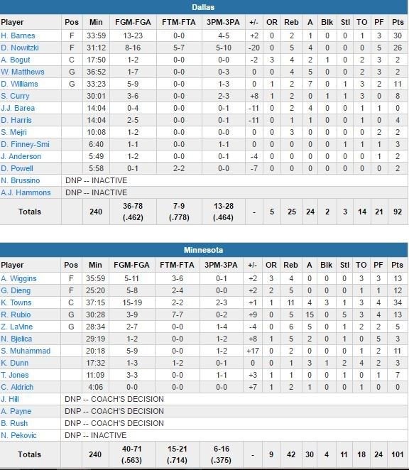 L’association Harrison Barnes (30 points à 13/23) – Dirk Nowitzki (26 points à 8/16, 5 rebonds et 4 passes) n’était pas mal non plus mais le 56.3% de Minnesota a eu raison des espoirs de Dallas. Rubio inscrit 9 points dans le 4ème quart, dont 2 paniers consécutifs durant un 8-0 qui a apporté un précieux air à Minnesota après que Dallas, mené de jusqu’à 21 points, soit revenu à 81-77. L’Espagnol rentre ensuite 2 lancers-francs à 2’08 de la fin pour donner 14 points d’avance aux locaux.