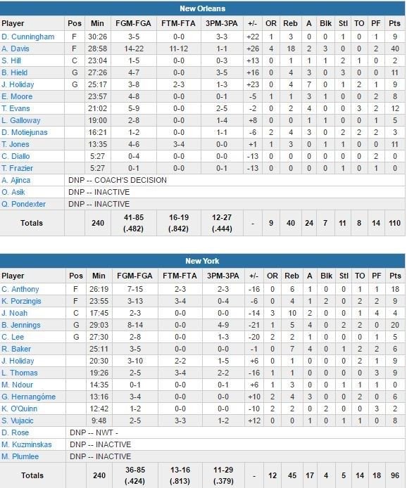 Sans Derrick Rose (dont le motif de l’absence n’était apparemment même pas connu de l’ensemble du staff), les Knicks (ensuite privé de Carmelo Anthony sur une exclusion dans le 3ème quart-temps) ont encaissé une nouvelle défaite au Madison Square Garden cette nuit, 110-96 face aux Pelicans d’Anthony Davis (40 points à 14/22, 18 rebonds et 3 contres mais sorti sur blessure à la hanche après 29 minutes de jeu).