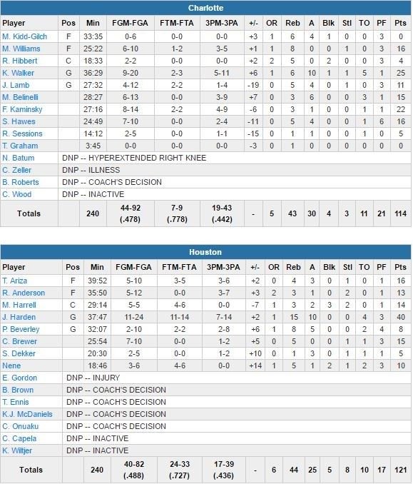 La fin de match n’a pas été de tout repos pour Houston, qui a laissé s’évaporer son avance de 18 points à 8 minutes de la fin en ratant 10 shoots d’affilée avant que Mike D’Antoni ne soit obligé de couper court avec un temps-mort à 2’26. Ryan Anderson a finalement rentré le premier shoot (un 3-points) de son équipe en plus de 4 minutes et après un contre de l’autre côté, Harden donne 4 points d’avance aux siens 115-111 à une minute de la fin. Kemba Walker (25 points à 9/20, 6 rebonds et 10 passes) réduit l’écart à un point longue distance dans la foulée mais un nouveau layup d’Harden maintient les Rockets en tête 117-114 à 28.6 secondes. Charlotte va ensuite manquer sa chance 3 fois de suite derrière la ligne à 3-points dans les dernières secondes.