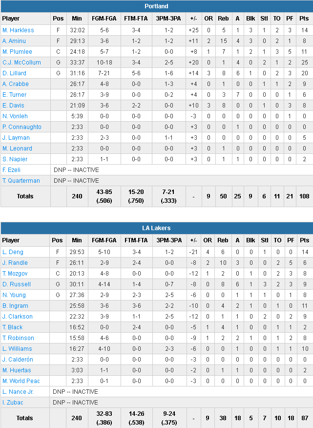 Comme souvent Damian Lillard (20 points à 7/21, 8 rebonds et 6 passes) et CJ McCollum (25 points à 10/18) ont brillé face aux Lakers. C’est toute l’attaque de Portland qui s’est régalée avec 50.6% au tir contre un horrible 38.6% aux Lakers. De plus les Blazers ne perdent que 6 ballons et captent 12 rebonds de plus. La recette pour un large succès qui s’est dessiné en seconde mi-temps, cauchemardesque pour les Lakers puisqu’à la pause ils menaient 57-55. Ils ont inscrit seulement 30 points, laissant filer les visiteurs.