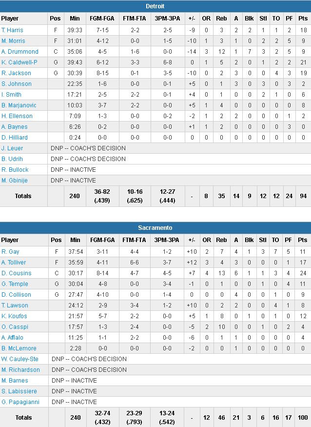 Menés par DeMarcus Cousins (24 points à 8/14, 13 rebonds et 6 passes) les Kings ont fait la différence dans un énorme dernier quart, remporté 32-17 alors qu’ils comptaient 13 points de retard à la pause et 9 à l’entame des 12 dernières minutes. Anthony Tolliver a été précieux avec 17 points alors que Kosta Koufos score 10 de ses 12 points dans le dernier quart. Les Pistons ont perdu leur adresse et n’ont pas su résister en fin de rencontre. Kentavious Caldwell-Pope signe 21 points à 6/8 à 3-pts, Reggie Jackson 19 points et Tobias Harris 18. Andre Drummond sort un petit match en attaque avec 9 points, 12 rebonds, 7 contre et 3 interceptions.