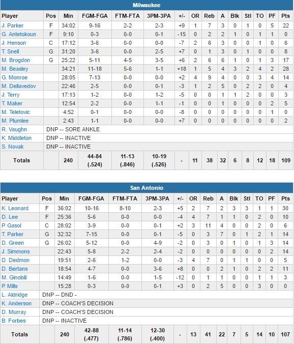 Les Spurs jouaient eux sans LaMarcus Aldridge, victime d’une gastro. Kawhi Leonard termine à 30 points à 10/16, 7 rebonds et 3 contres et est accompagné par 3 coéquipiers à 14 points : Tony Parker (14 points à 7/15 et 7 passes), Danny Green et Jonathon Simmons. Milwaukee passe devant pour la première fois depuis qu’il restait 3’24 à jouer dans le 1er quart-temps sur un layup de Jabari Parker (22 points à 9/16, 7 rebonds et 3 passes) à 2’56, 103-101. Après 2 lancers-francs de Beasley, les Spurs reprennent la tête 107-105 grâce à deux 3-points consécutifs signés Davis Bertans (11 points à 4/7 en 18 minutes) et Danny Green.