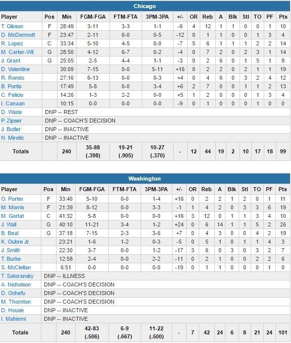 Les Bulls (39.8% aux tirs, 17 pertes de balles) jouaient sans Jimmy Butler (malade), Dwyane Wade (repos) et Nikola Mirotic (malade). Les deux équipes ont mené au score dans le dernier quart-temps et Wall égalisent à 99 partout sur un shoot proche de la ligne des lancers-francs à 47.4 secondes. Michael Carter-Williams est en échec sur un shoot contesté de l’autre côté à environ 30 secondes. Wall récupère le ballon sur un rebond d’Otto Porter Jr, emmène Carter-Williams dans l’écran de Gortat sur l’aile droite et rentre son shoot à 5m sur la tête de Robin Lopez. Après un temps-mort, Doug McDermott rate un long 3-points et Wall récupère le rebond alors qu’il ne reste qu’une seconde.
