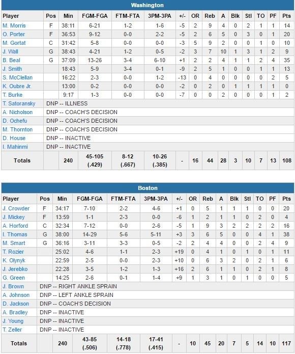 Bradley Beal et Otto Porter Jr ont répondu présent en face mais c’est surtout le non match de John Wall en attaque qui étonne : 9 points à 4/21, 7 rebonds et 10 passes. Le match a été tendu entre les deux équipes : 5 fautes techniques sifflées dont 2 à Boston pour violation des 3 secondes et une autre pour Beal lors d’une altercation verbale et physique avec Marcus Smart. Thomas rentre le lancer-franc de la faute et redonne 2 points d’avance à Boston mais les Wizards répondent par un 11-3 et prennent 10 points d’avance 79-69 et une belle maîtrise des rebonds.
