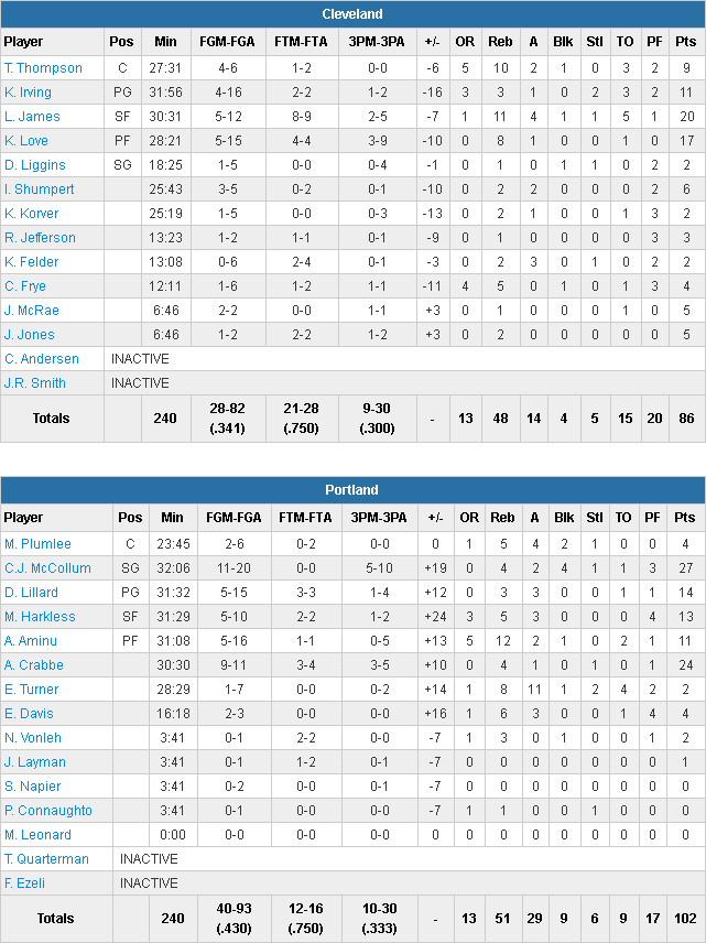 Lors du premier match entre les deux équipes l’attaque des Cavaliers, menée par un Kevin Love sur une autre planète, avait dynamité la défense de Portland mais cette fois les Cavs n’étaient pas aussi chauds, bien au contraire. Ils sont limités à 34.1% au tir et perdent 15 ballons pour seulement 3 joueurs à au moins 10 points : 20 points à 5/12, 11 rebonds et 4 passes de LeBron James, 17 points à 5/15 et 8 rebonds de Kevin Love et 11 points à 4/16 de Kyrie Irving. Difficile de gagner avec un Big 3 si peu performant et un supporting cast qui ne l’est pas non plus. Les Blazers ont été un peu plus en réussite avec 43% au tir dont 10 tirs à trois points et seulement 9 ballons perdus. CJ McCollum, l’homme en forme, continue de briller avec un nouveau match à au moins 25 points. Il signe 27 points à 11/20 dont 5/10 à 3-pts dont 21 unités en seconde mi-temps.. Allen Crabbe ajoute lui 24 points à 9/11 en sortie de banc et contrebalance la maladresse de Damian Lillard, limité à 14 points à 5/15. C’est le 4ème succès de suite des joueurs de l’Oregon face aux Cavaliers au Moda Center.