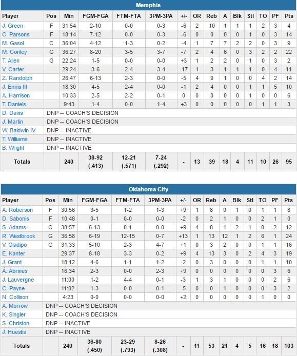 Enes Kanter et Victor Oladipo ajoutent respectivement 19 et 16 points face au trio Mike Conley (22 points à 8/20, 4 rebonds et 6 passes), Zach Randolph (14 points à 6/13 et 9 rebonds) et Chandler Parsons (14 points à 7/12). Marc Gasol (meilleur scoreur de son équipe avec presque 20 points par match) a été limité à 9 points à 4/12, 7 rebonds et 7 passes. OKC fait la course en tête 55-44 à la pause mais Memphis revient à 59-58 en milieu de 3ème quart.