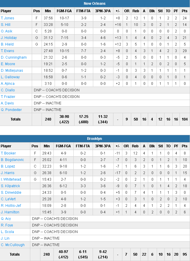 Le trio Tyreke Evans (29 points à 10/15 et 4 interceptions), Terrence Jones (24 points à 10/17 et 12 rebonds) et Jrue Holiday (21 points à 7/15) a compensé cette absence avec un gros match. A l’exception des 14 points et 10 rebonds de Solomon Hill ça a été le désert derrière mais le petit 42.2% au tir a suffi face à la pire équipe de la ligue. Les Nets ont artillé à 3-pts avec 42 tentatives mais n’en ont réussi que 9, à l’image du 1/6 de Brook Lopez (20 points à 9/18). Ce dernier a été épaulé par les 18 points de Sean Kilpatrick et les 15 de Joe Harris, mais encore une fois la défense a fait défaut, tout comme la gestion du money time.