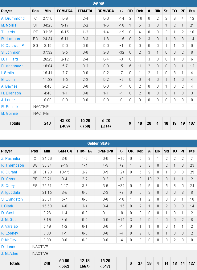 Lors des 11 premières minutes les deux équipes se sont répondues coup sur coup, aucune ne prenant plus d’une possession d’avance jusqu’à un 8-0 en 53 secondes des locaux grâce notamment à 2 3-pts de Ian Clark, 37-30. Mais le second 5 de Detroit a remis les deux équipes à égalité sur un 8-0 et le chassé-croisé s’est poursuivi jusqu’à la mi-temps et sur un And 1 c’est finalement Stephen Curry qui a mis les siens en tête 60-58 à la pause. Au retour des vestiaires les champions 2015 ont une nouvelle fois appuyé sur l’accélérateur sous l’impulsion de Thompson, Durant et Curry. Les 3 ont largement contribué à un 10-0 qui a fait un break définitif. En grande réussite, notamment à l’extérieur, les Californiens se sont envolés en prenant 20 puis 24 points d’avance sur un nouveau 3-pts de Clark, 101-77 après 3 quarts. Steve Kerr a alors pu faire tourner son effectif jusqu’au buzzer final.