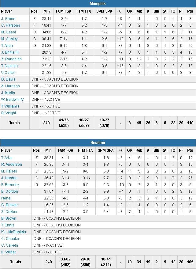 Tony Allen bat son record en saison avec 22 points (9/10, 4 rebonds et 3 passes), Mike Conley ajoute 17 points à 6/14, 6 rebonds et 9 passes, Zach Randolph 16 points à 7/16 et 12 rebonds, Marc Gasol 14 points à 6/9, 6 rebonds et 6 passes, Troy Daniels 13 points et James Ennis 12. James Harden signe 27 points à 6/14, 3 rebonds et 9 passes et son équipe encaisse une 2ème défaite de rang pour la première fois de la saison ! Houston domine tranquillement la 1ère mi-temps (31-25 dans le 1er quart et 33-26 dans le 2ème) et mène 64-51 à la pause.