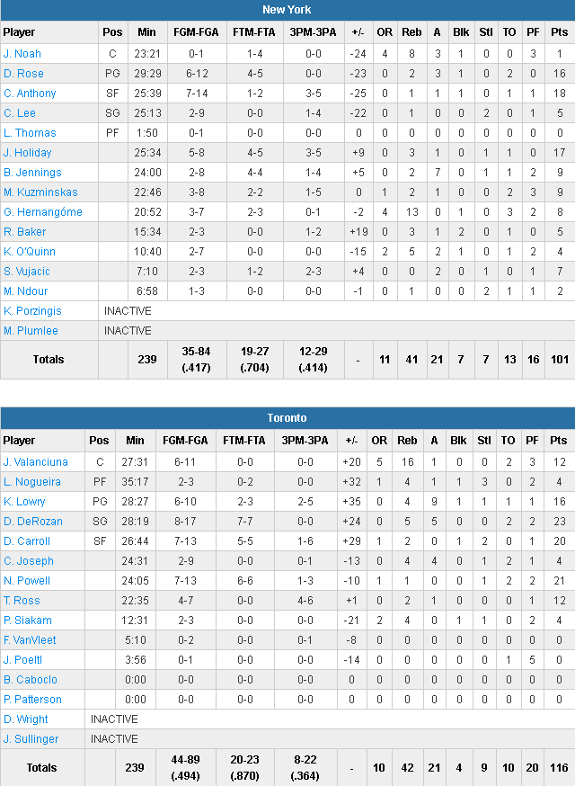 Toronto a remporté les deuxième et troisième quarts sur le score de 69-36 avec seulement 8 points dans le 3ème acte, entamé par un 25-2 ! Les Raptors ont profité des largesses défensives de leurs adversaires et 6 joueurs finissent avec au moins 10 points. DeMar DeRozan signe 23 points à 8/17, 5 rebonds et 5 passes, DeMarre Carroll 20 points à 7/13 et Kyle Lowry 16 points à 6/10 et 9 passes. Côté Knicks à noter les 18 points à 7/14 de Carmelo Anthony et les 16 à 6/12 de Derrick Rose.