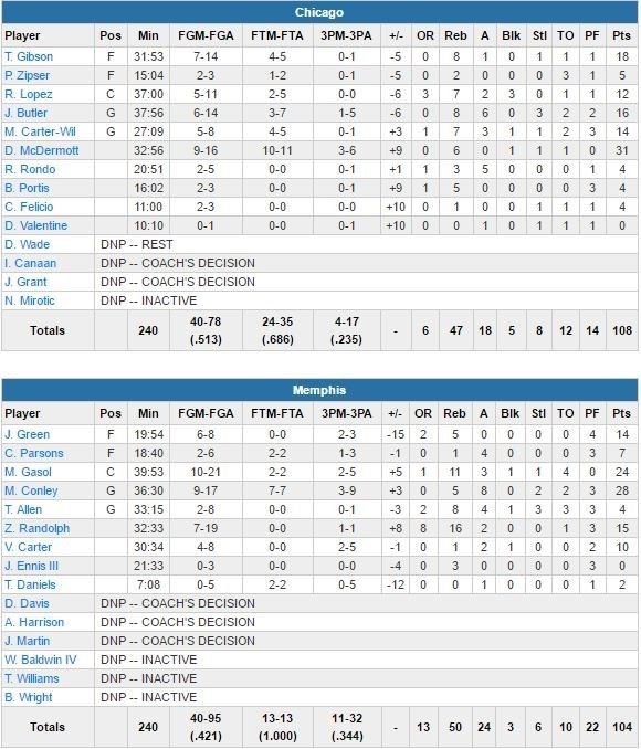 Taj Gibson ajoute 18 points et 8 rebonds pour les Bulls qui, à égalité 104 partout à 25 secondes de la fin, ont bénéficié d’un shoot à 5m de Butler (qui avait également rentré un jump shot un peu plus lointain à 53 secondes) et de 2 lancers-francs de McDermott pour s’assurer une 2ème victoire de rang. Mike Conley termine meilleur marqueur de Memphis avec 28 points (plus 8 passes), Marc Gasol signe lui 24 points et 11 rebonds.