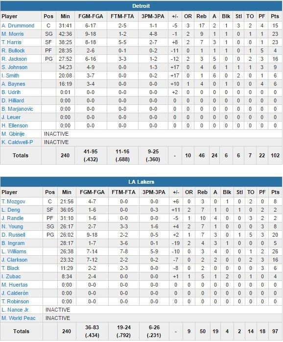 À noter : les Lakers ont pris jusqu’à 14 points d’avance en 1ère mi-temps, mais Detroit était devant de 2 points à la pause (59-57) grâce à un shoot au buzzer du milieu de terrain signé Drummond. Le 3ème quart-temps a été remporté 16-15 par les Pistons. Kentavious Caldwell-Pope était absent pour un 2ème match d’affilée (épaule), Jon Leuer a lui manqué un 4ème match de rang en raison d’un genou douloureux. Les Lakers ont eux perdu Tarik Black dans le 3ème quart pour une apparente blessure à la cheville. Julius Randle ne signe que 2 points en 32 minutes (10 rebonds, 4 passes).