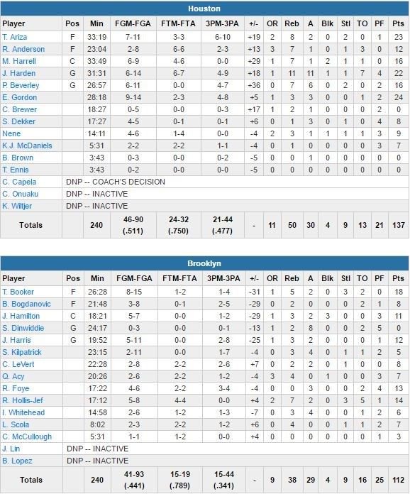 Tenus à 105 points contre les Wolves et les Grizzlies, les Rockets comptaient déjà 104 points inscrits après 3 quarts-temps face à Brooklyn, qui perd au passage un 10ème match consécutif. Eric Gordon ajoute 24 points (4/8 à 3-points), Trevor Ariza 23 (6/10 à 3-points) et Houston, 5 joueurs à au moins 16 points, shoote aussi à 21/44 à 3-points. L’équipe de Mike D’Antoni marque 74 points en 1ère mi-temps et égale son record en saison mais les Nets s’accrochent avec seulement 8 points de retard. L’écart grimpe en début de 3ème quart avec un 13-2 en faveur des Rockets (87-68) et atteint les 20 points plus tard dans la période quand Harden trouve Sam Dekker sur alley oop.