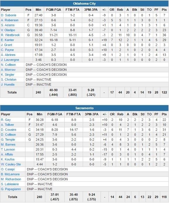 La 1ère mi-temps est souvent composée de shoots manqués et turnovers pour Westbrook (ce qui n’empêche pas Oklahoma City d’être devant 59-46 à la pause), qui va se rattraper dans le 3ème quart en inscrivant 11 points pour permettre au Thunder de prendre 9 points d’avance, 88-79. Les Kings reviennent à 3 points par deux fois dans les dernières 25 secondes, mais Abrines et Oladipo rentrent chacun 2 lancers-francs et Westbrook vole un ballon avant de trouver un layup pour définitivement assurer la victoire. Le meneur avait aussi inscrit deux 3-points et 7 points en tout sur 80 secondes pour donner 15 poins d’avance à OKC en milieu de 4ème quart.