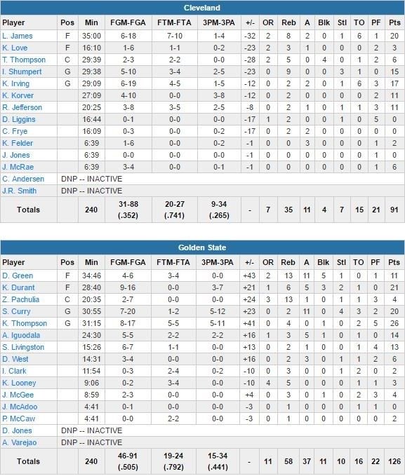 À noter : Zaza Pachulia signe 4 points et 13 rebonds, Andre Iguodala 14 points à 5/5 et 5 passes. Kyle Korver 11 points. L’altercation entre Green et James a eu lieu à 6’55 de la fin de la 1ère mi-temps et alors que Golden State menait 52-35. Green bloque la transition des Cavs en stoppant James peu après le milieu de terrain et ce dernier s’écroule par terre. Green hérite d’une faute flagrante 1 et se dirige vers le banc en mimant un flop de la part du Cavalier. Cleveland, deuxième équipe NBA au nombre de 3-points cette saison (496) et 3ème au pourcentage (38.5% de moyenne) n’a shooté qu’à 2/12 longue distance dans le 1er quart-temps et n’a fait qu’une seule passe décisive. Golden State comptait 24 passes à 4 en 1ère mi-temps.