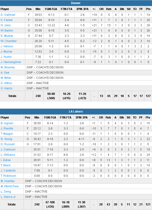 Encore une fois Denver a été mené par un énorme Nikola Jokic, qui compile 29 points à 12/22, 15 rebonds et 3 contres en 34 minutes. Il a été bien aidé par le duo Will Barton (26 points à 9/16 et 8 passes) et Kenneth Faried (20 points à 9/10). Danilo Gallinari, Emmanuel Mudiay et Wilson Chandler ne sont pas en reste avec 14 points chacun. Denver a fait souffrir la défense des Californiens en shootant à 56.8% dont un 11/26 derrière l’arc. Difficile dans ces conditions pour les Lakers d’espérer quoi que ce soit, mais ils y ont cru en fin de match après avoir remonté quasiment 17 points de retard. C’est le banc qui a fait le job pour revernir avec 24 points de Lou Williams, 19 de Jordan Clarkson, 14 de Tarik Black et 11 points, 13 rebonds d’Ivica Zubac. Nick Young ajoute lui 22 points dans le 5 majeur mais les Californiens shootent à seulement 43.5%, même s’ils compensent avec 20 rebonds offensifs.