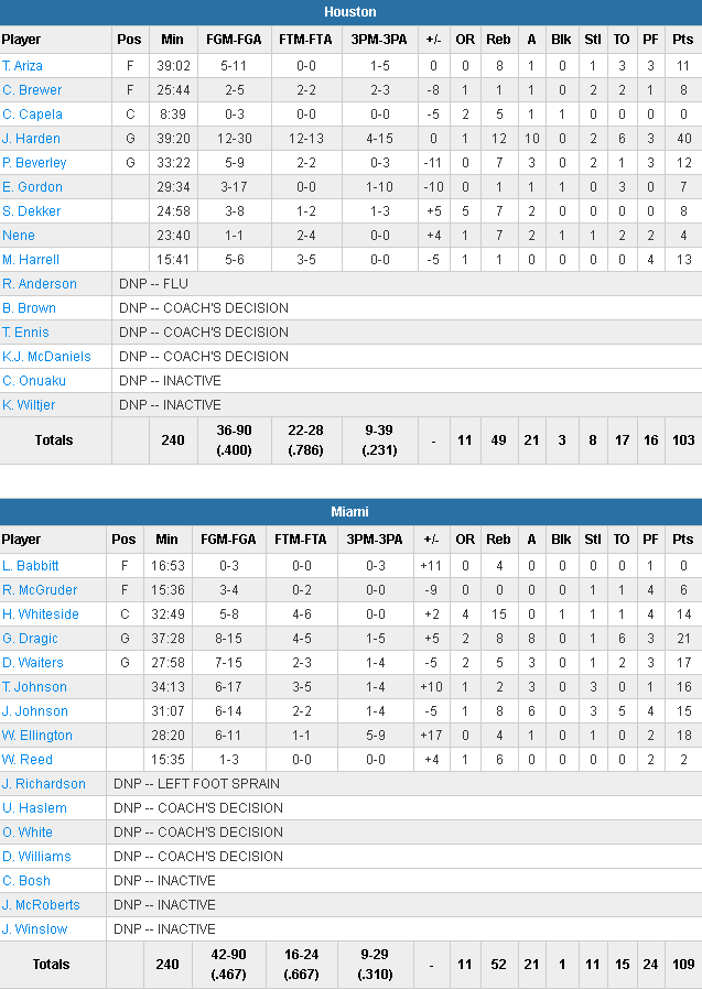 Les Floridiens ont été menés par Goran Dragic (21 points à 8/15, 8 rebonds et 8 passes), et 5 autres joueurs qui inscrivent au moins 14 points : 18 pour Wayne Ellington, 17 pour Dion Waiters, 16 pour Tyler Johnson ou encore 14 (15 rebonds) pour Hassan Whiteside. Ils shootent à 46.7%, bien mieux que les Texans, encore une fois en grand manque d’adresse avec 40% et un horrible 9/39 derrière l’arc en l’absence de Ryan Anderson, malade. James Harden a été le seul à surnager avec un énorme match, son 4ème triple-double avec au moins 40 points puisqu’il signe 40 points à 12/30 (4/15 à 3-pts), 12 rebonds et 10 passes. La dernière passe a été délivrée à 12 secondes de la fin alors que le Heat ne défendait plus.