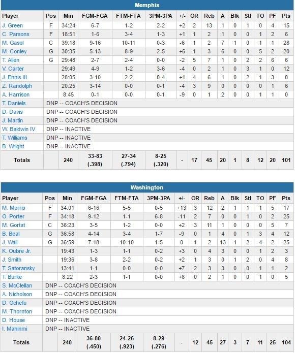 Memphis est de son côté mené par les 28 points de Marc Gasol et les 20 points de Mike Conley. Washington (27 passes décisives à 20) est devant 66-51 à la pause grâce à un 53.3% de réussite aux tirs mais après la pause, l’équipe va manquer ses 7 premiers shoots et cela permettra à Memphis (39.8% de réussite contre 45% pour les Wizards) de recoller au score grâce à un 26-17 dans le 3ème quart. Le 4ème quart sera également à l’avantage des visiteurs mais Washington a su conserver une avance suffisante via des lancers-francs de dernière minute signés Wall (qui plante également 2 layups importants dans les 2 dernières minutes) et Beal pour aller au bout.