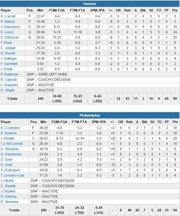 Et paf, 7ème victoire en 9 matchs pour les Sixers ! Joel Embiid, 26 points à 6/13, 9 rebonds, 2 passes et 2 contres hier, a totalement changé le visage de sa franchise, victorieuse des Raptors 94-89 cette nuit avec également 18 points à 7/14 et 5 rebonds d’Ersan Ilyasova.
