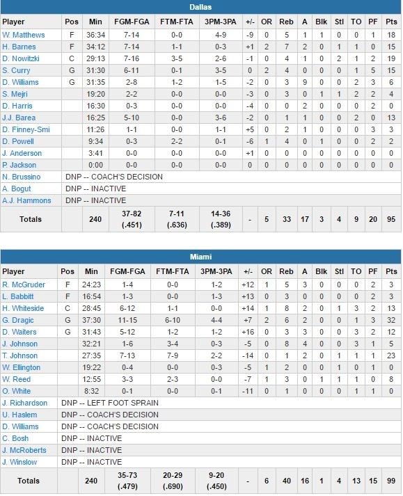 Miami, également aidé par les 13 points (6/12, 8 rebonds et 2 passes) d’Hassan Whiteside et les 12 unités (5/12, 3 rebonds et 3 passes) de Dion Waiters, remporte là un 2ème succès consécutif après une victoire contre Houston mardi. Dallas, qui a pris jusqu’à 10 points d’avance, se tire une balle dans le pied en fin de match avec un 1/8 aux tirs qui met fin à ses chances de reprendre l’avantage après avoir été mené de 9 points. Nowitzki rentre un lancer sur deux à 18.5 secondes de la fin pour ramener les Mavs à 95-92. Miami aura ensuite besoin de griller deux temps-morts pour réussir à remettre le ballon en jeu sur la possession suivante, et James Johnson va réussir 2 lancers-francs 5 secondes plus tard pour assurer la victoire.