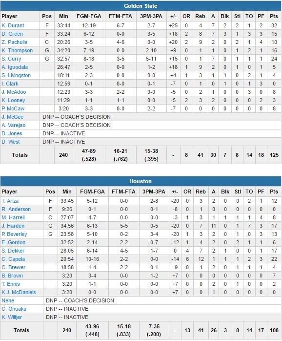 Kevin Durant termine meilleur marqueur de son équipe avec 32 points à 12/19, 4 rebonds, 7 passes et 2 contres et Stephen Curry le suit avec 24 points à 8/18 (5/11 à 3-points) et 8 passes dans cette 6ème victoire consécutive de Golden State). Trois autres joueurs signent au moins 10 points pour les Warriors, les trois autres titulaires (Draymond Green, Klay Thompson et Zaza Pachulia). Côté Rockets Clint Capela est le meilleur scoreur des Texans avec 22 points à 10/16 et 12 rebonds en même pas 21 minutes de jeu. Harden termine à 17 points à 6/13, 7 rebonds et 11 passes.