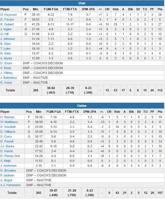 Son 0/2 aux lancers-francs en prolongation permettra aussi à Joe Johnson (15 points) d’égaliser à 3-points 107 partout en fin de match après un rebond offensif du Français (29ème match consécutif à au moins 10 rebonds) suite à son deuxième manqué à 1’50. Deron Williams (16 points, il avait donné 3 points d’avance 107-104 à Dallas sur 2 layups consécutifs à 1’36) manque un shoot de l’autre côté et Joe Ingles assure 2 lancers-francs qui vont donner un avantage définitif aux visiteurs à 1’35 du buzzer final.