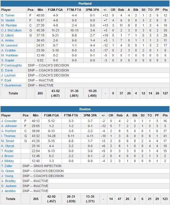 Thomas rentre un 3-points à 1’24 de la fin de la prolongation pour donner 1 point d’avance à Boston mais Al-Farouq Aminu refait passer Portland devant sur la possession suivante avec 2 lancers-francs. Lillard ajoute ensuite un layup plus le lancer (113-110 à 10.8 secondes) et Mason Plumlee un jump shot près du panier plus un lancer-franc dans les dernières 24 secondes.