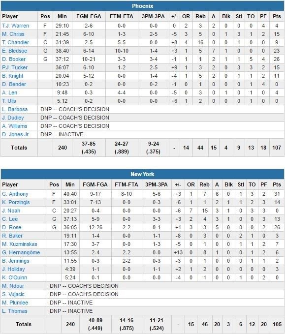 Le 3ème quart, marqué par les 12 points d’Anthony, se termine sur une égalité 90 partout. New York (mené 61-55 à la pause), qui avait passé un 35-29 à ses adversaires dans la période précédente, prend 5 points d’avance (103-98) en début de 4ème mais sera finalement limité à 15 points dans ce dernier quart. Booker répond en provoquant une faute de Courtney Lee et ses 2 lancers-francs permettent à Phoenix de recoller à 1 point. Rose rate un shoot en tête de raquette dans la foulée, Tucker manque lui un layup mais est imité dans la foulée par le rookie des Knicks (13ème défaite en 16 matchs) Ron Baker, qui laisse la place au shoot de la gagne de Booker quelques instants plus tard.