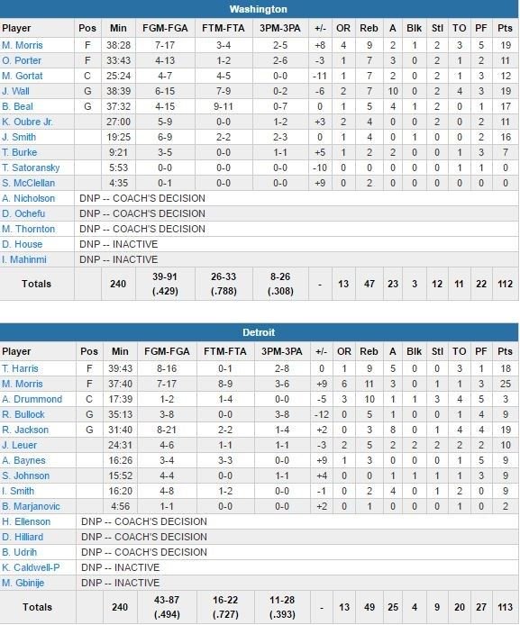 Les Wizards marquent les 9 premiers points de la rencontre mais Detroit passe devant 20-19 sur un 3-points de Marcus Morris puis mène 30-26 à la fin de la première période. Les Pistons prennent leur plus grosse avance de la 1ère mi-temps 41-30 sur un 3-points de Reggie Bullock. Washington revient à 3 points à 2 occasions mais reste mené 61-55 à la pause. Les locaux contrôlent le 3ème quart et montent jusqu’à +16. Ils sont devant 98-82 après 3 quarts-temps mais voient Detroit se rapprocher à 6 points (105-99) sur un layup de Morris. L’avantage passe ensuite d’un camp à l’autre jusqu’à ce que Washington prenne l’avantage 110-109 sur un dunk de Morris à 2’14.