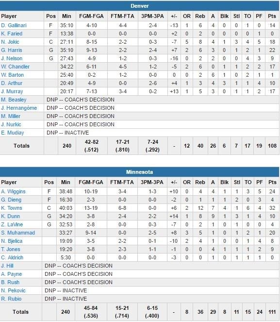Karl-Anthony Towns avait jusque-là dominé son matchup individuel avec Nikola Jokic dans chacun des 2 matchs qui avait opposé Minnesota à Denver cette saison. Cette nuit, il a enfin obtenu la victoire qui allait avec. Les Wolves s’imposent ainsi (2ème victoire de rang) 111-108 au Target Center avec 32 points à 13/19, 12 rebonds, 7 passes et 4 contres de son jeune leader face à un Jokic à 18 points à 8/15, 8 rebonds et 4 passes.