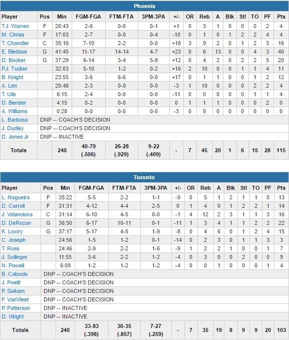 Phoenix a couru après le score à partir de 2’13 dans le 2ème quart jusqu’à une égalisation à 95 partout à 7’29 de la fin. Les Suns (45 rebonds à 35, 52 points à 36 dans la peinture) vont ensuite passer un 18-6 décisif à leurs adversaires pour prendre le contrôle du match. Devin Booker ajoute 20 points à 6/14 (5/8 à 3-points) et son équipe sweepe Toronto en saison régulière pour la première fois depuis la saison 2013-14. Kyle Lowry est limité à 15 points à 1/9 à 3-points et se fait éjecter sur une faute flagrante 2 suite à un contact avec la tête de Brandon Knight à 1’30 de la fin. DeMar DeRozan termine meilleur marqueur des siens avec 22 points (6/17, 3 rebonds et 4 passes) mais lui aussi quitte le match prématurément (à 1’30) après s’être tordu la cheville en atterrissant sur le pied d’un coéquipier.