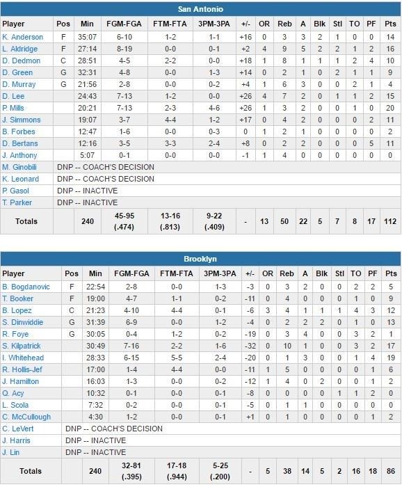 Sans 4 joueurs cadres de l’équipe, San Antonio s’est baladé à Brooklyn cette nuit, 112-86. Kawhi Leonard (douleur à la main), Pau Gasol (opération de la main gauche), Tony Parker (pied gauche) et Manu Ginobili (journée de repos prévue mais surtout douleurs au dos) absents, ce sont Patty Mills et LaMarcus Aldridge qui se sont illustrés avec respectivement 20 points à 7/13, 3 rebonds et 2 passes et 16 points à 8/19, 9 rebonds et 5 passes. Sept joueurs au total atteignent les 10 points minimum dans un match qui a tourné au blowout dans le 3ème quart (39-27).