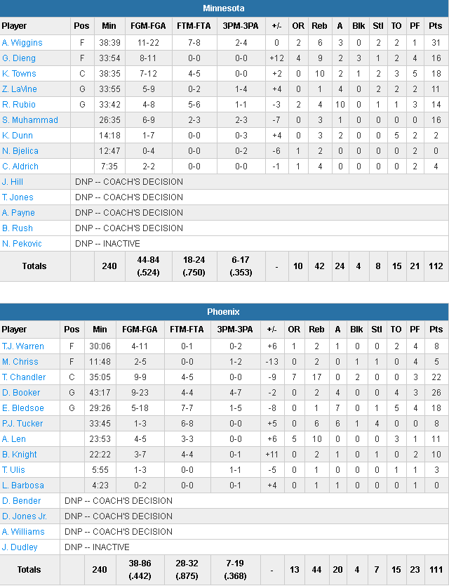 Wiggins avait justement raté un de ses deux lancers à 12.1 secondes de la fin, ce qui avait permis derrière à PJ Tucker de propulser les Suns en tête sur deux lancers, 111-110 avec 6.3 secondes à jouer. Assez pour que le jeune loup trouve la cible. Il termine avec 31 points à 11/22 et 6 rebonds et mène 5 autres joueurs à au moins 10 points. KAT compile 18 points et 10 rebonds tandis que Gorgui Dieng ajoute 16 points, 9 rebonds et Ricky Rubio 14 points et 10 passes. Shabazz Muhammad n’est pas en reste avec 16 points en sortie de banc pour une équipe des Wolves qui shoote à 52.4%. Les Suns sont eux moins adroits avec 44.2% mais ils captent 13 rebonds offensifs et shootent à 28/32 sr la ligne des lancers. Les deux arrières Devin Booker (26 points à 9/23) et Eric Bledsoe (18 points à 5/18) ont été très maladroits et c’est Tyson Chandler qui a fait un chantier avec 22 points à 9/9 et 17 rebonds.