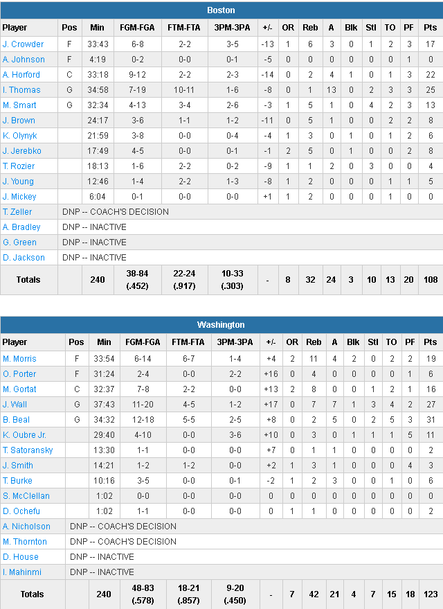 Beal a scoré 13 de ses 31 points (à 12/18) dans le dernier acte alors que John Wall ajoute lui 21 points à 11/20, 7 rebonds et 7 passes. Markieff Morris (19 points et 11 rebonds) et Marcin Gortat ont été précieux (16 points à 7/8 et 8 rebonds). Les Wizards ont mis au supplice la défense des Celtics avec 57.8% au tir contre seulement 45.2% pour les visiteurs, menés comme toujours par Isaiah Thomas, un peu maladroit avec 25 points à 7/19 et 13 passes, et inhabituellement absent en dernier quart avec un 1/7. Al Horford ajoute 22 points à 9/12 et Jae Crowder 17 points à 6/8. Boston shoote à seulement 10/33 derrière l’arc contre 9/20 aux locaux.