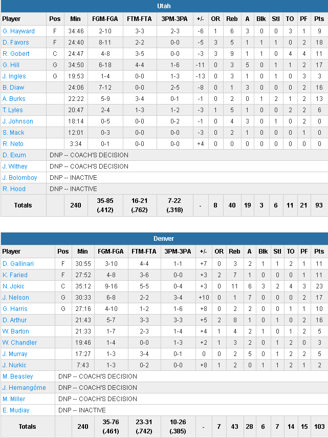 Nikola Jokic a compilé 23 points à 9/16, 11 rebonds, 6 passes, 3 contres et 2 interceptions dans son duel face à Rudy Gobert (11 points et 9 rebonds). Denver a profité d’un Jazz maladroit 41.2% et s’est appuyé sur son collectif avec 6 joueurs à au moins 10 points dont 17 pour Jameer Nelson (7 dans les 4 dernières minutes) et 16 pour Darrell Arthur. Côté Utah Gordon Hayward signe 9 points à 2/10 tandis que George Hill ajoute 17 points à seulement 6/18. Les deux meilleurs Jazz sont Boris Diaw (16 points à 7/12) et Derrick Favors (18 points à 8/11).