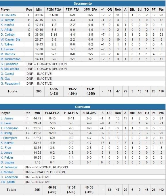 Arron Afflalo (14 points à 5/8) a rentré le 3-points de la gagne à 17.3 secondes en prolongation. LeBron James, en triple-double, (24 points à 8/15, 13 rebonds et 11 passes) ratera dans la foulée une tentative lointaine à 3-points et son équipe sera ensuite obligée de faire faute sur DeMarcus Cousins (28 points à 11/30, 11 rebonds et 9 passes), qui rentrera 1 lancer sur 2 pour assurer la victoire.