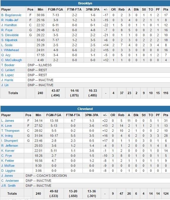 Leur meilleur marqueur (20.6 pts/match pour Lopez) et meilleur rebondeur (Trevor Booker, malade) absents, les Nets sont menés par les 18 points de Sean Kilpatrick et les 17 points de Bojan Bogdanovic. Cleveland prend jusqu’à 11 points d’avance en 1ère mi-temps puis rentre au vestiaire en tête 55-47 sur un 3-points de Richard Jefferson au buzzer. James et Irving, respectivement 20 et 10 points dans le 3ème quart, vont aider les Cavs à prendre 24 points d’avance, 86-62. Brooklyn réagit avec un 9-0 pour revenir à 86-73 mais Irving enchaîne avec deux 3-points et un drive, 94-73.