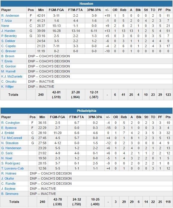 De retour après avoir manqué les 2 derniers matchs de son équipe suite à une contusion au genou, Embiid était encore incertain 45 minutes avant le début du match. Les deux équipes sont à égalité 61 partout à la mi-temps mais Houston démarre son 3ème quart sur un 12-0 en à peine 3 minutes. Harden y marque 10 points, dont un dunk pour le +12, 75-63. À l’entame du dernier quart, les Rockets sont en tête 94-82. Le 4ème quart démarre sur 8 points consécutifs d’Embiid pour Philadelphie et son 2ème 3-points d’affilée ramène les siens à 94-90 à 10’47. Houston répond par un 6-0 et les Sixers ne se rapprocheront ensuite plus à moins de 4 points jusqu’à la fin. Nik Stauskas réduit l’écart à 117-112 à 52.8 secondes sur un reverse mais après un manqué des Rockets, Embiid se fait contrer sur une tentative à 3-points par Nene à 20 secondes de la fin.