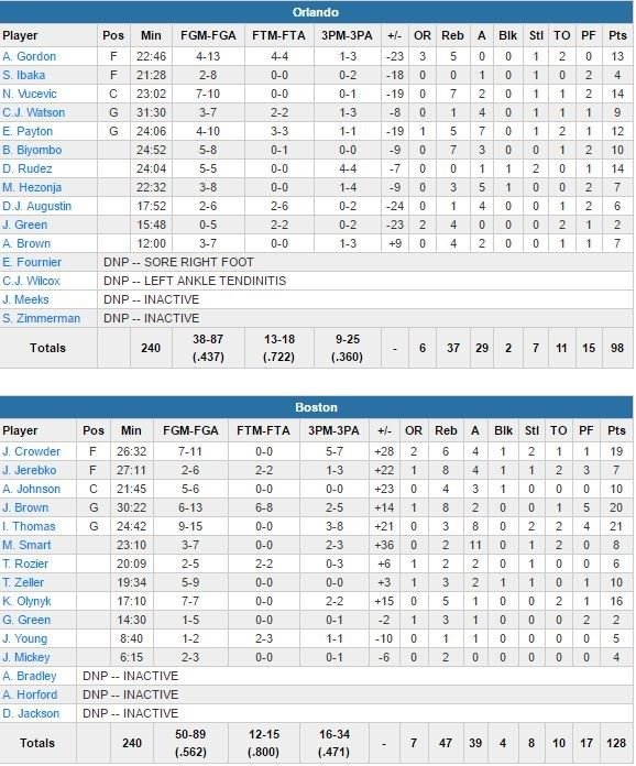Il a suffi de trois quarts-temps à Isaiah Thomas (21 points à 9/15 et 8 passes) pour signer un 30ème match consécutif à au moins 20 points. Le meneur All-Star a qui plus est pu regarder la fin du match tranquillement assis sur le banc, son équipe ayant fait le nécessaire pour écarter Orlando très tôt. Boston bat son record de points cette saison avec cette victoire 128-98. Le rookie Jaylen Brown signe son record en carrière avec 20 points, Jae Crowder ajoute 19 unités et Kelly Olynyk est parfait avec 16 points à 7/7. Après un 15-0 pour conclure le 1er quart-temps, les Celtics ont déroulé. Cinq joueurs d’Orlando atteint au moins les 10 points mais aucun ne dépasse les 14 unités.