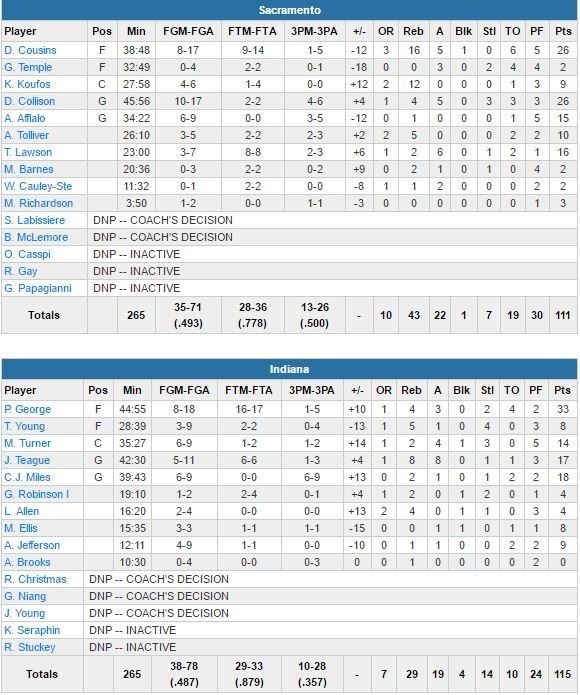 33 points à 8/18, 16/17 aux lancers-francs, 4 rebonds et 3 passes pour Paul George dans la victoire d’Indiana cette nuit sur Sacramento en prolongation, 115-111. La star a inscrit les 6 derniers points du 4ème quart pour forcer 5 minutes supplémentaires et a ensuite donné l’avantage aux siens 3 fois en prolongation pour aider Indiana à se remettre d’un déficit de 16 points acquis au cours du match (et de 11 points à 6’30 du dernier quart). Jeff Teague ne passe lui pas loin de son premier triple-double en carrière avec 17 points, 8 rebonds et 8 passes. Côté Kings, on compte 2 joueurs à 26 points : DeMarcus Cousins (8/17, 16 rebonds, 5 passes) et Darren Collison (10/17, 4 rebonds et 5 passes).