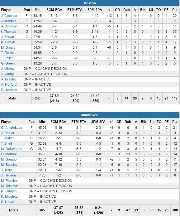 Boston (3ème victoire consécutive, 14/40 à 3-points) prend jusqu’à 6 points d’avance en prolongation mais Tony Snell (12 points à 4/6) vient égaliser avec deux 3-points consécutifs, 108 partout. Crowder rentre 2 lancers-francs sur la possession suivante (à 28 secondes) puis 2 autres pour assurer la victoire à 10 secondes de la fin après un shoot manqué d’Antetokounmpo.