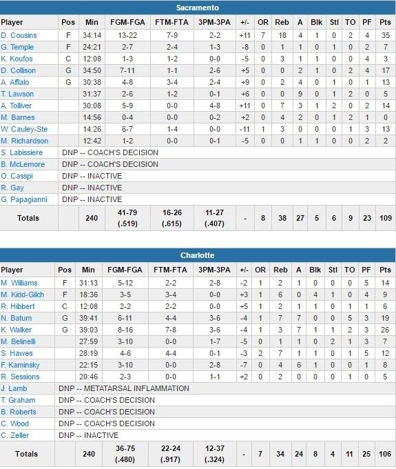 Les Hornets ont eu une chance de passer devant dans les dernières secondes sur une passe de Kemba Walker (26 points à 8/16, 3 rebonds et 7 passes) à un Frank Kaminsky ouvert en tête de raquette mais ce dernier va balancer un airball à 1 seconde de la fin. Cousins prend le rebond et obtient la faute, son 1/2 établit le score final. Nicolas Batum signe 19 points à 6/11, 7 rebonds et 7 passes. Le Français perd néanmoins actuellement beaucoup de ballons (31 sur ses 8 derniers matchs avec 4 matchs à au moins 5 turnovers).