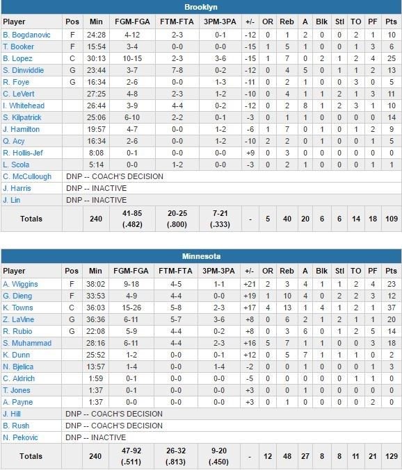Minnesota shoote à 51% sur le match et passe un 17-8 à ses adversaires sur points sur seconde chance pour bien rebondir après une défaite à domicile face aux Pacers jeudi. Brook Lopez termine à 25 points à 3/6 à 3-points et 7 rebonds pour Brooklyn, qui restent sur 5 défaites consécutives (21 en 23 matchs). Trop rapide pour Lopez, Towns s’amuse dans la raquette et au-delà (2/3 à 3-points) alors que les Nets ont aussi testé Justin Hamilton (pas assez costaud) et Trevor Booker (pas assez grand) sur lui.