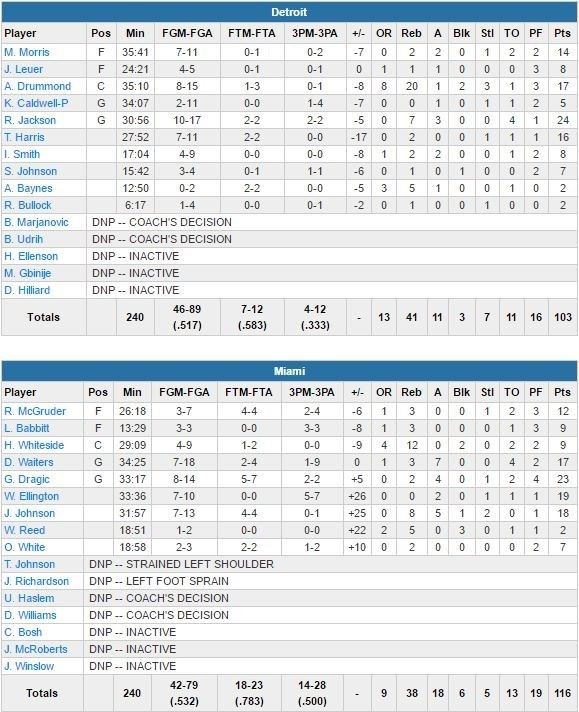 En difficulté pendant 3 quarts-temps face aux Pistons, Miami a joué son meilleur basket de la soirée dans le 4ème quart-temps pour finalement s’imposer 116-103 dans le sillage de Goran Dragic (23 points à 8/14 et 4 passes), Wayne Ellington (19 points à 7/10), James Johnson (18 points à 7/13, 8 rebonds et 5 passes) et Dion Waiters (17 points à 7/18 et 7 passes)