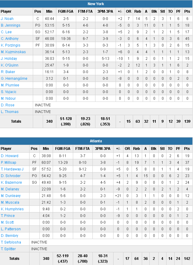 Le début de la 4ème prolongation a été totalement fou avec dans l’ordre et coup sur coup des 3-pts de Jennings, Bazemore, Holiday, Bazemore et enfin Jennings, pour un score de 139-136 pour les Knicks avec 2’36 à jouer. Bazemore sur un drive et Paul Millsap avec un lancer, ont égalisé avec un peu plus d’une minute à jouer. Puis après une violation des 24 secondes des Knicks, suite à un rebond offensif, Millsap a mis Atlanta en tête 141-139 avec 27 secondes à jouer. Lee a alors balancé une passe en tribune permettant à Schröder de mettre un lancer. Les Knicks ont eu l’occasion de décrocher une 5ème prolongation mais les deux shoots derrière l’arc de Lee ont rebondi sur l’arceau.