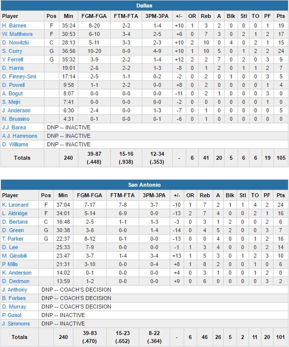 Kawhi Leonard termine à 24 points à 7/17, 7 rebonds et 2 passes pour les Spurs, 16-6 à domicile cette saison (40-1 l’année dernière). Dallas a réussi à revenir d’un déficit de 15 points en 1ère mi-temps. À 17 secondes de la fin, Curry trouve un layup ouvert pour donner l’avantage 103-98 aux Mavericks après que San Antonio soit revenu à 100-98 suite à un contre de Leonard sur Curry et une interception de Manu Ginobili sur Dirk Nowitzki (15 points et 10 rebonds). Les Mavericks ont par ailleurs échappé à une cruciale perte de balle grâce à un temps-mort de Rick Carlisle à 25 secondes de la fin et alors que Danny Green allait voler le ballon des mains de Curry. Dallas ne perd que 7 ballons, le plus petit total d’un adversaire des Spurs cette saison. San Antonio a limité ses adversaires à 5 points sur les dernières 3’47 du match sans pour autant réussir à concrétiser.