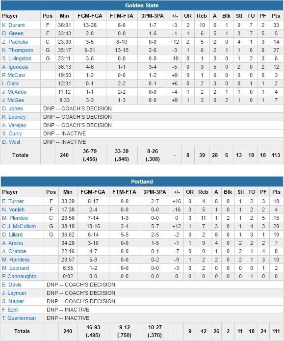 En début de match, Golden State avait rapidement pris les commandes 20-10 puis 33-24 et 51-30 avant d’encaisser un 20-2 marqué par les 3-points consécutifs de Lillard et un reverse de Turner pour revenir à 53-50 à la mi-temps. Andre Iguodala enchaîne ensuite deux 3-points consécutifs pour récupérer 12 points d’avance (84-72) mais Portland répond encore et revient à 90-86 à 8’52 sur un dunk de Mo Harkless.