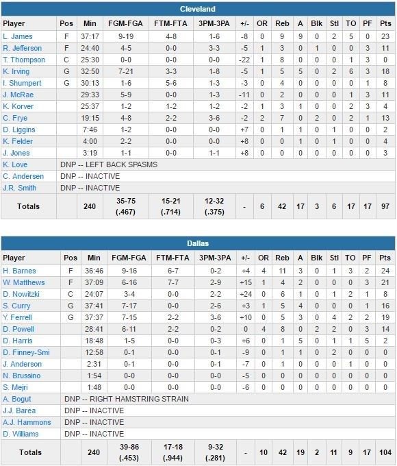 Le meneur des Cavaliers restait sur une série de 6 matchs à au moins 20 points. À San Antonio dimanche, Ferrell avait déjà rentré 2 lancers-francs importants en fin de match pour assurer la victoire de Dallas. LeBron James termine à 23 points à 9/19, 9 rebonds et 9 passes mais n’inscrit avec Irving qu’un seul point dans le 4ème quart-temps. Le duo combine aussi pour un 2/14 à 3-points et commettent 11 des 17 pertes de balles de leur équipe, alors que Dallas ne perd que 9 ballons sur l’ensemble de la rencontre.
