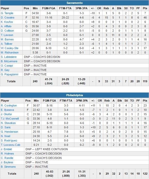 Menés de 16 points en 1ère mi-temps, les Sixers vont inscrire 42 points dans le 3ème quart-temps et tenir jusqu’au bout. Ils peuvent tout de même remercier Arron Afflalo, qui manque le 3-points de l’égalisation au buzzer. Cousins (qui a rentré ses 5 premiers shoots et planté 18 points dans le 1er quart) marque 16 points dans le 4ème quart et donne l’avantage à Sacramento 114-113. Il perd ensuite le ballon sur une passe à terre interceptée et fait une faute sur Gerald Henderson. Ce dernier rentre ses 2 deux lancers-francs, donnant 5 points d’avance à Philadelphie, qui restait sur 2 défaites mais dont le mois de janvier est étonnant : 10-5. Rappelons que le bilan de l’équipe pour l’intégralité de la saison 2015-16 était de 10-72…