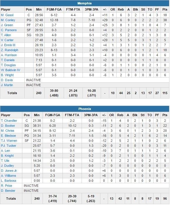 Marc Gasol et Zach Randolph ajoutent 18 points chacun alors qu’en face, Devin Booker est le meilleur marqueur des Suns avec 22 points et que son coéquipier rookie Marquese Chriss bat son record en carrière avec 20 points. Phoenix n’a jamais mené dans ce match et a pris jusqu’à 30 points de retard. Les Suns restent désormais sur 4 défaites consécutives. Tout juste sorti d’un record en carrière (41 points) dans une défaite contre Denver samedi, Eric Bledsoe est cette fois limité à 8 points à 2/9.